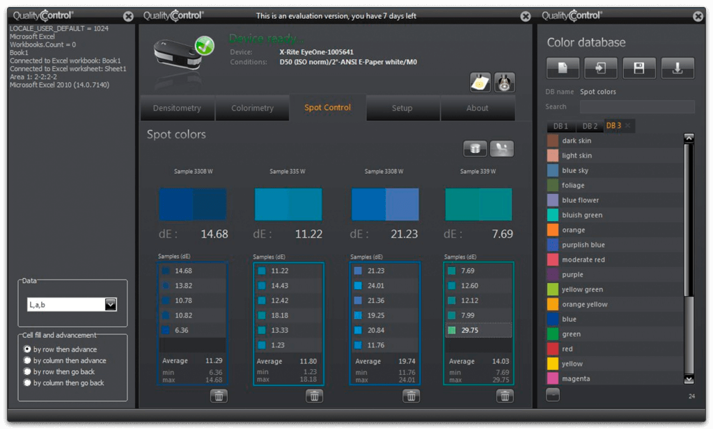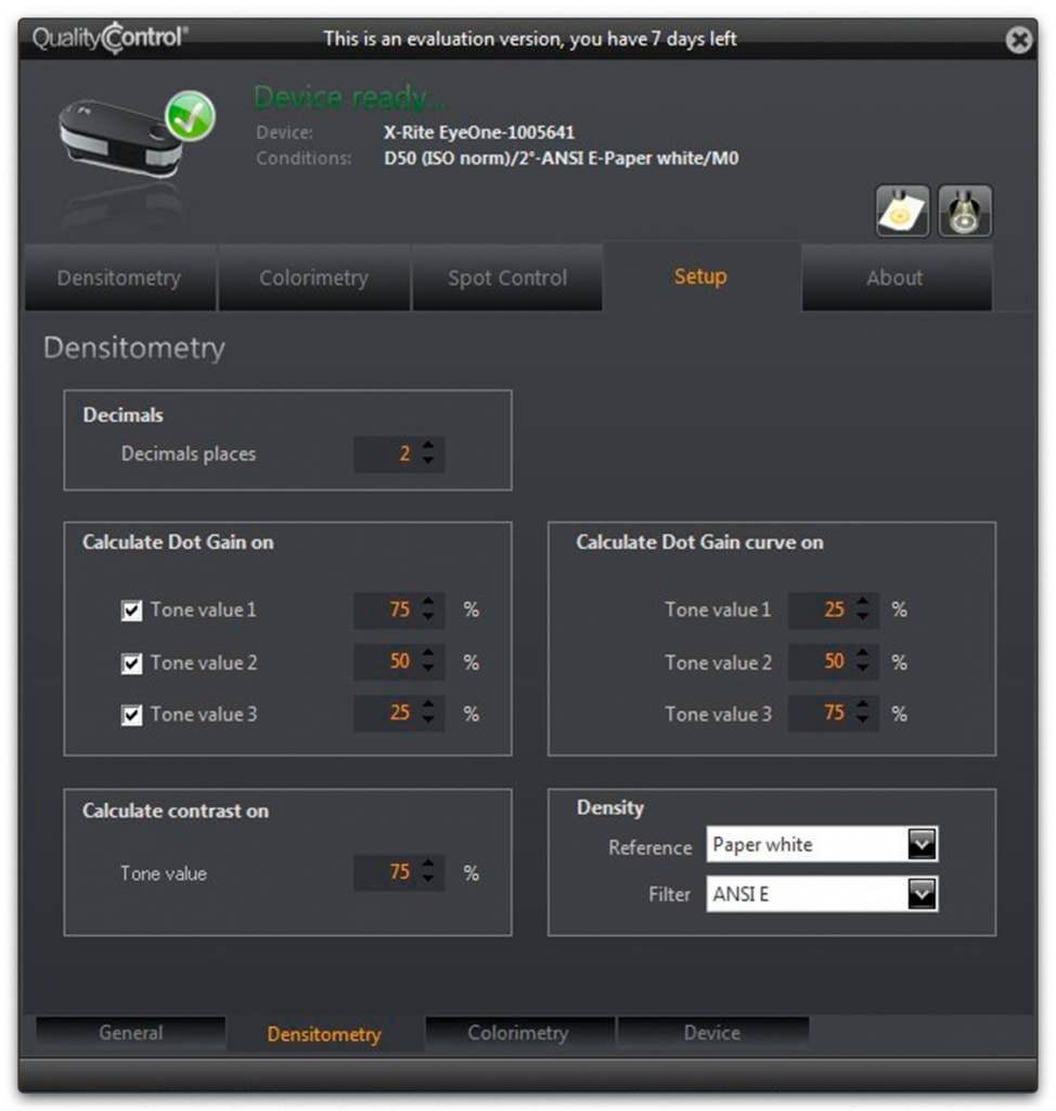 Color difference formula, illuminant, observer, metamerism index,tone values, and status filter.