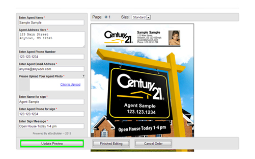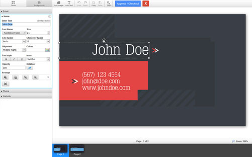 Interchangeable Background Images: Like the banner example above, this business card example shows how you can give your customers their choice of background images. The eDocBuilder system easily swaps between those images. Click the Backgrounds button at the top left of the template, and then select the background image you want to use. Click Reset to revert to the default background image.
