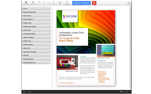 Interchangeable Background Colors: In addition to background images, eDocBuilder also allows you to give your customers a choice of solid color swatches for the template background. You define the colors that your customer can select. This option is also found by clicking the Backgrounds button at the top left of the template. Choose any solid color swatch to change the background to that color. Click Reset to revert to the default background image.